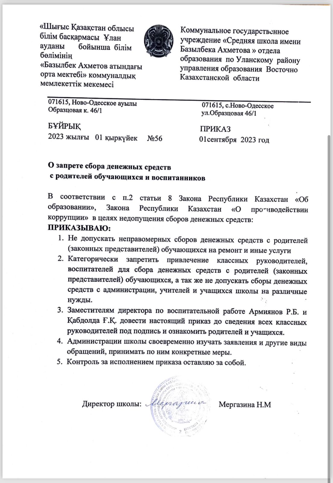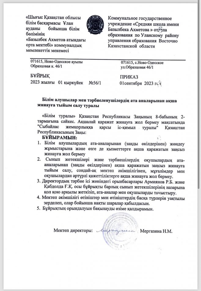 01 сентябрь 2023 0 1 2 3 4 5 Білім алушылар мен тәрбиеленушілердің ата аналарынан ақша жинауға тыйым салу туралы