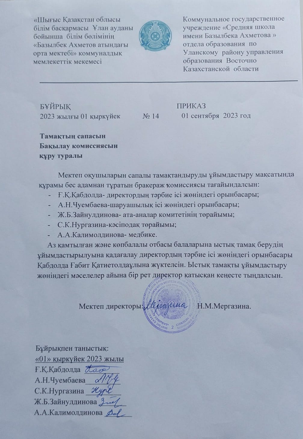 Тамақтың сапасын бақылау комиссиясын құру туралы » Базылбек Ахметов атындағы орта мектеп